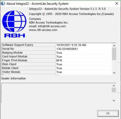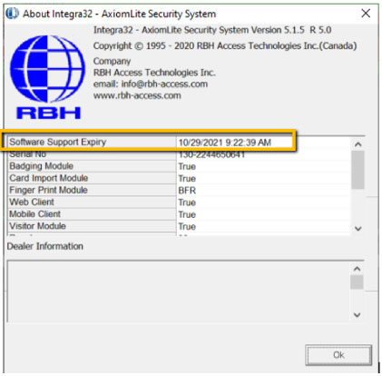RBH software support and software upgrades within the same release version are available free of charge for systems where the Software Support Expiry Date / Maintenance End Date has not lapsed.Integra32TM Release 5.0 Security System software comes with a 14 day trial period, after which the system will not run unless the user registers with RBH to activate.